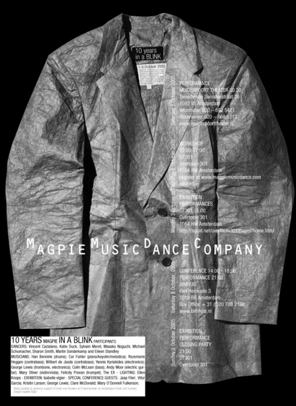 Magpie was spearheaded by Katie Duck and was founded in Amsterdam in 1995 by dancers Eileen Stanley, Vincent Cacialono, Martin Sonderkamp, Sharon Smith, Michael Schumacher and Masako Naguchi with musicians Michael Vatcher and Mary Oliver and with light designer Ellen Knops. Magpie was formed in direct response to a need the artists had to re-consider and re-present Improvised performance within a contemporary context in Amsterdam and, as the work developed, internationally.